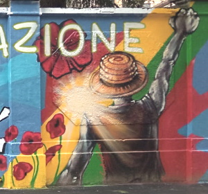 (da sinistra a destra scritte mescolate ai disegni ) P A C E STOP ALLA GUERRA 80 ANNI di LIBERAZIONE