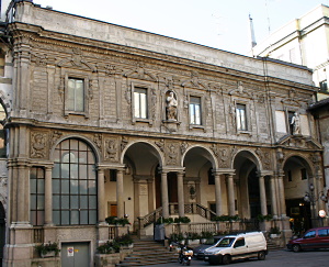 Il suo busto è il secondo da destra sulla fronte del portico delle Scuole Palatine. |