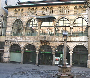 Loggia degli Osii, dovrebbero corrispondere (da sinistra a destra) a S.Stefano, S.Ambrogio, S.Agostino; S.Giovanni Battista, Maria, S.Pietro; S.Dionigi, S.Caterina, S.Lorenzo. Queste sono copie ottocentesche degli originali realizzati nel '300 dai Maestri Campionesi.