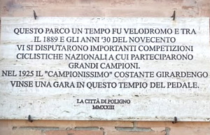 QUESTO PARCO UN TEMPO FU VELODROMO E TRA IL 1889 E GLI ANNI '30 DEL NOVECENTO VI SI DISPUTARONO IMPORTANTI COMPETIZIONI CICLISTICHE NAZIONALI A CUI PARTECIPARONO GRANDI CAMPIONI. NEL 1925 IL "CAMPIONISSIMO" COSTANTE GIRARDENGO VINSE UNA GARA IN QUESTO TEMPIO DEL PEDALE.