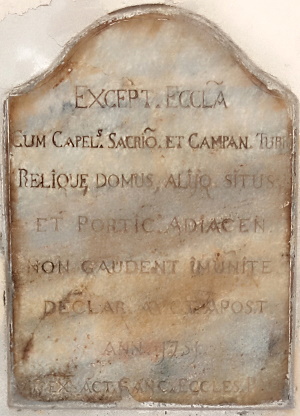 EXCEPT. ECCLÂ CUM CAPEL.S SACRIÔ ET CAMPAN. TURR. RELIQUE DOMUS ALIJQ. SITUS ET PORTIC. ADIACEN. NON GAUDENT IMÛNITE DECLAR. AUCTA POST ANN. 1751 EX ACT. SANC. ECCLES. P.