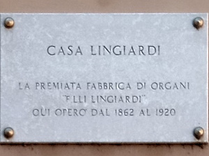 I fratelli Lingiardi erano Giacomo (Pavia 1811-1871) e Luigi (Pavia 1814-1882), figli di Giambattista (Mozzanica, Bg, 1765-Pavia 1850), un falegname restauratore di organi. Si affermarono con la costruzione dell'organo di S.Maria del Carmine e realizzarono strumenti con nuove soluzioni meccaniche e foniche. I figli di Luigi fabbricarono nel 1887 il grande organo della cattedrale di Pavia. L'azienda cessò l'attività nel 1920. |