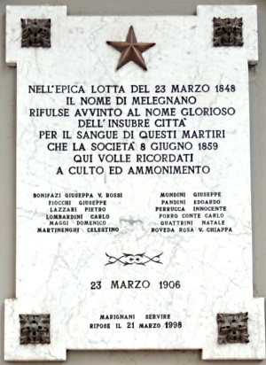 NELL'EPICA LOTTA DEL 23 MARZO 1848 IL NOME DI MELEGNANO RIFULSE AVVINTO AL NOME GLORIOSO DELL'INSUBRE CITTĄ PER IL SANGUE DI QUESTI MARTIRI CHE LA SOCIETĄ 8 GIUGNO 1859 QUI VOLLE RICORDATI A CULTO ED AMMONIMENTO