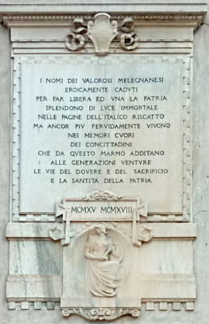 I NOMI DEI VALOROSI MELEGNANESI EROICAMENTE CADUTI PER FAR LIBERA ED UNA LA PATRIA SPLENDONO DI LUCE IMMORTALE NELLE PAGINE DELL'ITALICO RISCATTO MA ANCOR PIU FERVIDAMENTE VIVONO NEI MEMORI CUORI DEI CONCITTADINI CHE DA QUESTO MARMO ADDITANO ALLE GENERAZIONI VENTURE LE VIE DEL DOVERE E DEL SACRIFICIO E LA SANTITÀ DELLA PATRIA