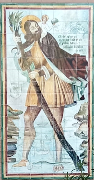 Sembra storicamente esistito un martire di nome Cristoforo ucciso in Licia (TR) sotto le persecuzioni dell'imperatore Decio nell'anno 250; su questa figura però nelle diverse parti della cristianità è fiorito un vasto e vario corredo di leggende, la più nota delle quali racconta che Cristoforo a guado portò in spalla il bambino Gesù, sempre più pesante mano a mano che procedeva la traversata del fiume. Oggi è il patrono degli automobilisti. |