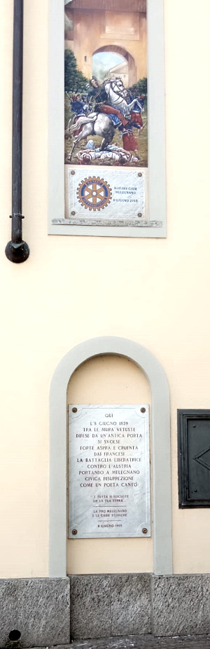 8 GIUGNO 2011 (lapide in basso) QUI L'8 GIUGNO 1859 TRA LE MURA VETUSTE DIFESE DA UN'ANTICA PORTA SI SVOLSE FORTE ASPRA E CRUENTA DAI FRANCESI LA BATTAGLIA LIBERATRICE CONTRO L'AUSTRIA PORTANDO A MELEGNANO CIVICA RISURREZIONE COME UN POETA CANTÒ: