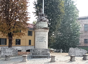 (monumento) (fronte) NELLA ESALTAZIONE DEL SACRIFICIO COMPIUTO DA COLORO CHE QUI SI RICORDANO MELEGNANO ERESSE AD ESEMPIO E MONITO PER LE GENERAZIONI FUTURE (fianco sinistro) GUERRA 1940-1945 (seguono 70 nomi su 3 colonne) PARTIGIANI (seguono 5 nomi) (fianco destro) GUERRA 1915-1918 (seguono 103 nomi su 3 colonne)