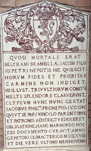 BELTRAMI BRAMBILLAE IACOBI FILII IO. PETRI NEPOTIS HIC QUIESCIT. HORUM FIDES ET PROBITAS CARMINE NON INDIGET. HI ILLUST. TRIVULTIORUM COMITÛ MELTII SLENDORE CLARUERUNT. CLYPEUM HUNC NUNC GESTAT IACOBUS PHILUS. PRONEPOS IV. CON. QUI UT SE PARI VINCULO PARENTIBUS ET PATRONIS ADSTRICTU EDOCERET OBLIGATIONE HANC MARMOREO HOC EDI DOCUMENTO CURAVIT. ANNO GENITORI CLIMATERICO MDLXVIII ET DIE VERE ULTIMO MEN. NOVEMB.