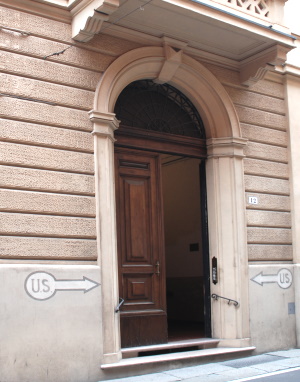 Questa scritta indicava l'ubicazione dell'uscita di sicurezza del rifugio; altre analoghe si trovano in via Garibaldi (palazzo Cassa di Risparmio), via S.Stefano 43, via Foscherari (ang. via Goidanich), piazza Maggiore (palazzo comunale), via Moline 1 A, via Galliera 68.