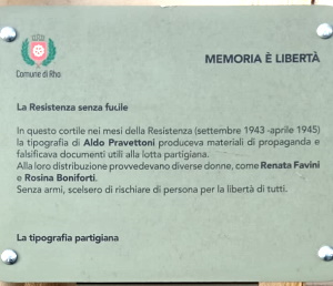 In questo cortile nei mesi della Resistenza (settembre 1943 -aprile 1945) la tipografia di Aldo Pravettoni produceva materiali di propaganda e falsificava documenti utili alla lotta partigiana. Alla loro distribuzione provvedevano diverse donne, come Renata Favini e Rosina Boniforti. Senza armi, scelsero di rischiare di persona per la libertà di tutti.