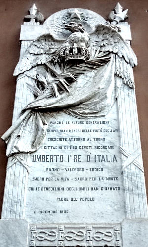 PERCHÈ LE FUTURE GENERAZIONI SEMPRE SIAN MEMORI DELLE VIRTÙ DEGLI AVI CRESCIUTE ATTORNO AL TRONO I CITTADINI DI RHO DEVOTI RICORDANO UMERTO I° RE D'ITALIA BUONO - VALOROSO - EROICO SACRO PER LA VITA - SACRO PER LA MORTE CUI LE BENEDIZIONI DEGLI UMILI HAN CHIAMATO PADRE DEL POPOLO