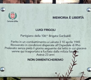 Ferito in un combattimento a Lainate il 10 aprile 1945 Ricoverato in condizioni disperate all'Ospedale di Rho Prelevato senza pietà il giorno seguente dal letto in cui giaceva venne qui trasportato e fucilato dalla milizia fascista. Aveva 23 anni