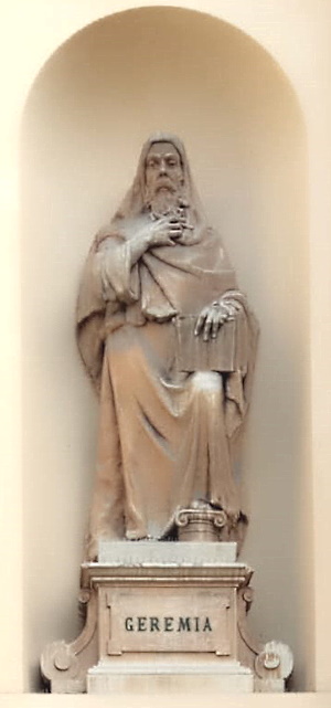 Profeta, nato verso il 650 a.C. presso Gerusalemme, aveva preannunciato l'asservimento degli ebrei sotto il potere babilonese, ciò che avvenne; poi predicò esortando il suo popolo ad affidarsi completamente a Dio; per questo venne perseguitato come disfattista e traditore, finché fu esiliato dalla sua terra e trascinato in Egitto, dove morì verso il 587 a.C. Da lui prende nome un libro dell'Antico Testamento. |