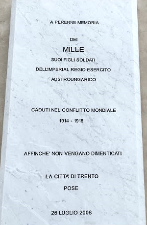 La particolarità di questa targa è che commemora i soldati trentini caduti con la divisa asburgica: Trento è piena di targhe che ricordano cittadini dell'Impero che coraggiosamente si arruolarono nell'esercito del Regno d'Italia, sentendosi italiani, ma ha dimenticato -fino a poco tempo fa- tutti quelli che trovarono la morte ubbidendo alla chiamata alle armi del loro governo; dal 2008 tale dimenticanza è stata sanata con questa targa. |