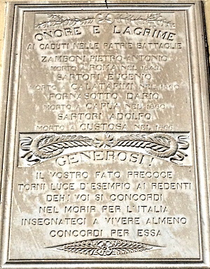 ONORE E LAGRIME AI CADUTI NELLE PATRIE BATTAGLIE ZAMBONI PIETRO ANTONIO MORTO A ROMA NEL 1949 SARTORI EUGENIO MORTO A CALATAFIMI NEL 1860 FORNASOTTO DARIO MORTO A CAPUA NEL 1860 SARTORI ADOLFO MORTO A CUSTOSA NEL 1866