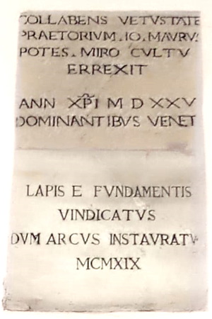 La ricostruzione del palazzo fu iniziata nel 1525, sotto la podesteria di Giovanni Moro. La seconda epigrafe dice che quella superiore fu trovata durante lavori di restauro del