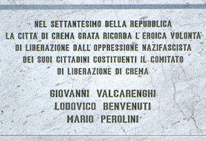 NEL SETTANTESIMO DELLA REPUBBLICA LA CITTA' DI CREMA GRATA RICORDA L'EROICA VOLONTA' DI LIBERAZIONE DALL'OPPRESSIONE NAZIFASCISTA DEI SUOI CITTADINI COSTITUENTI IL COMITATO DI LIBERAZIONE DI CREMA