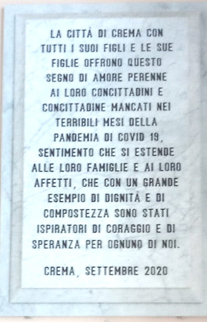 La targa č stata inaugurata il 28/9/2020 per ricordare tutti i cremaschi morti nel primo anno della pandemia di Coronavirus. |