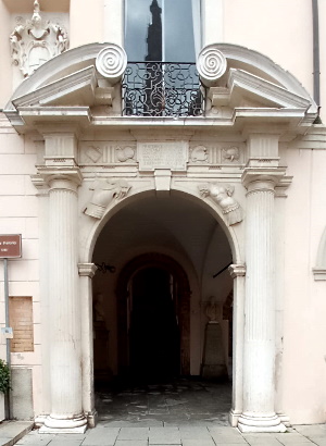 L'epigrafe ricorda che nel 1634 il podestà Marco Antonio Falier fece costruire il portale marmoreo del palazzo.