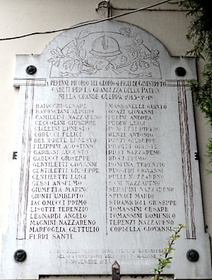 A PERENNE RICORDO DEI GLORIOSI FIGLI DI GINESTRETO CADUTI PER LA GRANDEZZA DELLA PATRIA NELLA GRANDE GUERRA 1915 - 1918 (segue elenco di 43 nomi su due colonne)