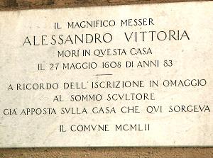 IL MAGNIFICO MESSER ALESSANDRO VITTORIA MORÌ IN QUESTA CASA IL 27 MAGGIO 1608 DI ANNI 83 ---- A RICORDO DELL'ISCRIZIONE IN OMAGGIO AL SOMMO SCULTORE GIÀ APPOSTA SULLA CASA CHE QUI SORGEVA IL COMUNE MCMLII