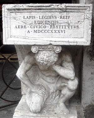 statua, scolpita nel 1541, rappresenta un uomo piegato che sorregge una rampa di scala; era il podio da cui venivano declamate leggi, ordinanze e sentenze di colpevolezza. I condannati alla fustigazione dovevano subire la pena nel tragitto da piazza S.Marco a Rialto e qui si sospendeva il tormento quando il reo baciava la statua.