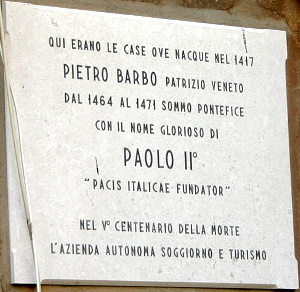 QUI ERANO LE CASE OVE NACQUE NEL 1417 PIETRO BARBO PATRIZIO VENETO DAL 1464 AL 1471 SOMMO PONTEFICE CON IL NOME GLORIOSO DI PAOLO II° "PACIS ITALICAE FUNDATOR"