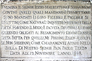FULMINA IL SIGNOR IDDIO MALEDIZIONI, E SCOMUNICHE CONTRO QUELLI QUALI MANDANO, Ò PERMETTANO SŸNO MANDATI LI LORO FIGLIOLI, E FIGLIOLE SI LEGITTIMI, COME NATURALI IN QUESTO HOSPEDALE DELLA PIETÀ HAVENDO IL MODO, E FACULTA DI POTERLI ALLEVARE, ESSENDO OBLIGATI AL RESARCIMENTO DI OGNI DANNO, E SPESA FATTA PER QUELLI, NE POSSONO ESSERE ASSOLTI SE NON SODISFANO, COME CHIARAMENTE APPARE NELLA BOLLA DI NOSTRO SIGNOR PAPA PAOLO TERZO DATA ADI 12 NOVENBRE L'ANNO 1548
