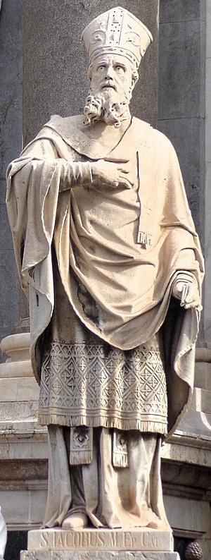 Guardando la facciata della cattedrale è la statua a sinistra sulla balaustra del sagrato. La statua è opera dello scultore catanese Lorenzo Grasso (1897). |