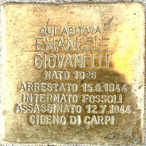 QUI ABITAVA EMANUELE GIOVANELLI NATO 1926 ARRESTATO 15.6.1944 INTERNATO FOSSOLI ASSASSINATO 12.7.1944 CIBENO DI CARPI