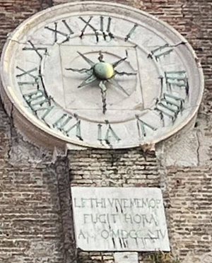 Non è una meridiana ma un orologio meccanico; l'ho qui accolto per la presenza del motto ("Vivi memore della morte/il tempo fugge/anno 1764"). Si trova sul campanile della chiesa di